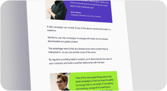 “Different people prefer to interact in different ways. Make sure you’re sending a mix of video content, case studies, decks and more to ensure you’re connecting with each lead in their preferred way!” James Sutton, Campaign Marketing Executive, Cognism A drip campaign can consist of any of the above-mentioned emails in a cadence. We like to use drip campaigns to engage with leads who’ve already downloaded our gated content. The advantage here is that you already know what content they’re interested in, so you can provide more of the same. By regularly providing helpful content, you’ll demonstrate the value of your company and build a positive relationship with the lead. “One of the many great things about drip email campaigns is that you have the ability to change them in an instant. If something isn’t working, change it! If something is working well, use it as inspiration for your other campaigns.” James Sutton, Campaign Marketing Executive, Cognism The ANYTHING BUT BASIC guide to email marketing / 26