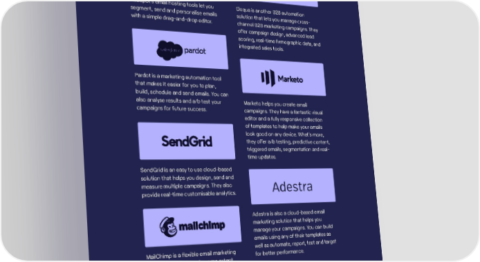Hubspot’s email hosting tools let you Eloqua is another B2B automation segment, send and personalise emails solution that lets you manage cross- with a simple drag-and-drop editor. channel B2B marketing campaigns. They offer campaign design, advanced lead scoring, real-time firmographic data, and integrated sales tools. Pardot is a marketing automation tool that makes it easier for you to plan, build, schedule and send emails. You can also analyse results and a/b test your Marketo helps you create email campaigns for future success. campaigns. They have a fantastic visual editor and a fully responsive collection of templates to help make your emails look good on any device. What’s more, they offer a/b testing, predictive content, triggered emails, segmentation and real- time updates. SendGrid is an easy to use cloud-based solution that helps you design, send and measure multiple campaigns. They also provide real-time customisable analytics. Adestra is also a cloud-based email marketing solution that helps you manage your campaigns. You can build emails using any of their templates as MailChimp is a flexible email marketing well as automate, report, test and target tool that’s free to use to some extent. for better performance. They’re known for their ease of use and customisable campaigns. The AThe ANYTNYTHING BUT BHING BUT BAASIC gSIC guide tuide to emo email mail markarkeetingting / / 2929
