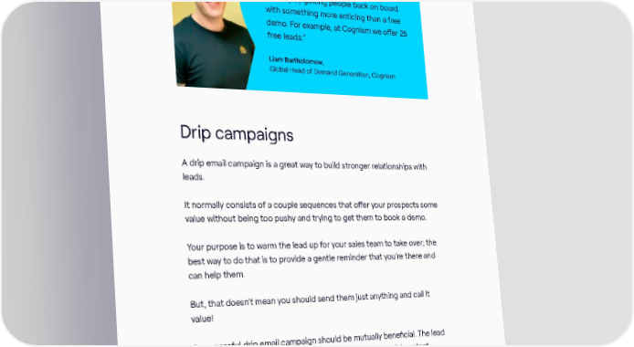 “Rekindle nurtures are great to fix a ‘leaky bucket’ of leads. You’re reducing the barrier to entry by getting people back on board with something more enticing than a free demo. For example, at Cognism we offer 25 free leads.” Liam Bartholomew, Global Head of Demand Generation, Cognism Drip campaigns A drip email campaign is a great way to build stronger relationships with leads. It normally consists of a couple sequences that offer your prospects some value without being too pushy and trying to get them to book a demo. Your purpose is to warm the lead up for your sales team to take over; the best way to do that is to provide a gentle reminder that you’re there and can help them. But, that doesn’t mean you should send them just anything and call it value! A successful drip email campaign should be mutually beneficial. The lead will consider you a valuable contact if you’re sending useful content. The ANYTHING BUT BASIC guide to email marketing / 25