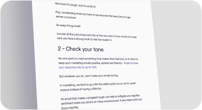 Short emails work best because your prospects can skim and see what you have to say without needing to scroll down. This helps them to remember your words and engage with you when they have a spare moment. We know it’s tough, but it’s worth it! Plus, condensing what you have to say ensures that every line of copy serves a purpose. So keep things brief! Include all the juicy/important info at the very start of your email and make sure you have a strong hook to reel the reader in. 2 - Check your tone No one wants to read something that makes them feel bad, so it’s best to keep your marketing emails positive, upbeat and friendly - it can increase your response rate by up to 15%! But whatever you do, don’t make your emails boring. In marketing, we tend to go with the safest option so as not to upset anyone instead of having a little fun. An email that makes a prospect laugh can help to mitigate any negative sentiment when you land in an inbox unannounced. It also helps build your brand identity. So if your email annoys some people, but makes others laugh, it’s engaging. And engaging is always better than boring. The ANYTHING BUT BASIC guide to email marketing / 11