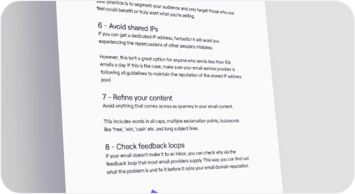 5 - Target interested buyers Mass emailing prospects who don’t fit your TAM isn’t going to get you anywhere; it will only get you marked as spam. Best practice is to segment your audience and only target those who you feel could benefit or truly want what you’re selling. 6 - Avoid shared IPs If you can get a dedicated IP address, fantastic! It will avoid you experiencing the repercussions of other people’s mistakes. However, this isn’t a great option for anyone who sends less than 10k emails a day. If this is the case, make sure your email service provider is following all guidelines to maintain the reputation of the shared IP address pool. 7 - Refine your content Avoid anything that comes across as spammy in your email content. This includes words in all caps, multiple exclamation points, buzzwords like ‘free’, ‘win’, ‘cash’ etc. and long subject lines. 8 - Check feedback loops If your email doesn’t make it to an inbox, you can check why via the feedback loop that most email providers supply. This way, you can find out what the problem is and fix it before it ruins your email domain reputation. The ANYTHING BUT BASIC guide to email marketing / 34