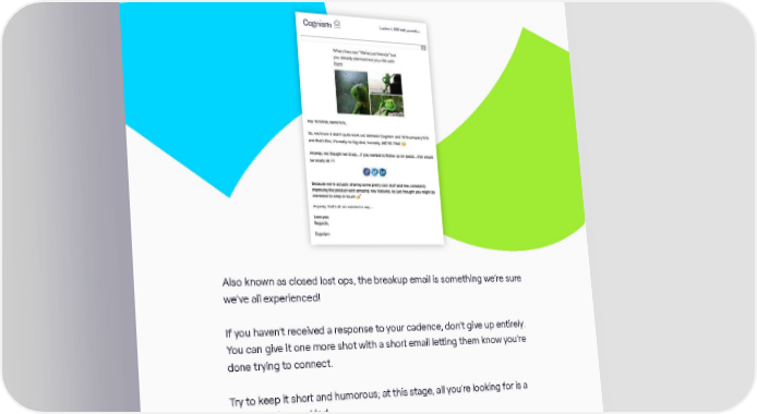 Break up emails The anything but basic guide to email marketing | 14 Break up emails Also known as closed lost ops, the breakup email is something we’re sure we’ve all experienced! If you haven’t received a response to your cadence, don’t give up entirely ou can give it one more shot with a Also known as closed lost ops, the breakup email is something we’re sure short email letting them know you’re done trying to connect we’ve all experienced! Try to keep it short and humorous at this stage, all you’re looking for is a reaction of some kind And, if you ask them to do something simple like give you a follow on social media, you’re creating another If you haven’t received a response to your cadence, don’t give up entirely. opportunity for engagement in the future You can give it one more shot with a short email letting them know you’re done trying to connect. Rekindle nurture emails Try to keep it short and humorous; at this stage, all you’re looking for is a reaction of some kind. And, if you ask them to do something simple like give you a follow on social media, you’re creating another opportunity for engagement in the future. The ANYTHING BUT BASIC guide to email marketing / 23 www.cognism.com |