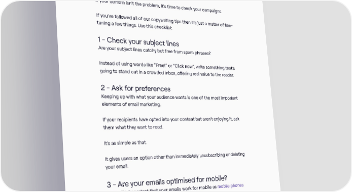 Improving your email campaigns: 3 top tips If your domain isn’t the problem, it’s time to check your campaigns. If you’ve followed all of our copywriting tips then it’s just a matter of fine- tuning a few things. Use this checklist: 1 - Check your subject lines Are your subject lines catchy but free from spam phrases? Instead of using words like “Free!” or “Click now”, write something that’s going to stand out in a crowded inbox, offering real value to the reader. 2 - Ask for preferences Keeping up with what your audience wants is one of the most important elements of email marketing. If your recipients have opted into your content but aren’t enjoying it, ask them what they want to read. It’s as simple as that. It gives users an option other than immediately unsubscribing or deleting your email. 3 - Are your emails optimised for mobile? Lastly, it’s important that your emails work for mobile as mobile phones constitute 70% of global website traffic. This means at least half of your prospects are using mobile to check their emails. Top-level executives or CEOs will check their emails on their mobiles as they move between meetings. The ANYTHING BUT BASIC guide to email marketing / 35