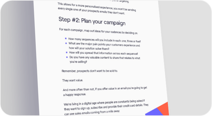 Segmenting your lists makes it easier to run campaigns for each target audience. It also ensures your emails won’t get marked as spam. Plus, you’ll gain a better understanding of who you’re targeting. This allows for a more personalised experience; you won’t be sending every single one of your prospects emails they don’t want. Step #2: Plan your campaign For each campaign, map out ideas for your cadences by deciding on: How many sequences will you include in each: one, three or five? What are the major pain points your customers experience and how will your solution solve them? How will you spread that information across each sequence? Do you have any valuable content to share that relates to what you’re selling? Remember, prospects don’t want to be sold to. They want value. And more often than not, if you offer value in an email you’re going to get a happy response. We’re living in a digital age where people are constantly being asked if they want to sign up, subscribe and provide their credit card details. They can see sales emails coming from a mile away. What makes yours different? Value. The ANYTHING BUT BASIC guide to email marketing / 7