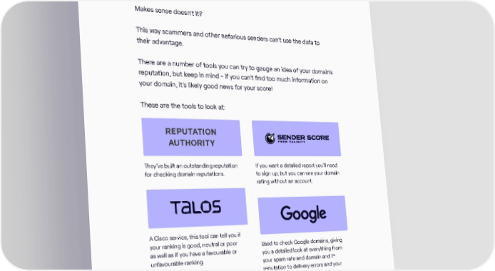 The anything but basic guide to email marketing | 19 Factors considered for your score include: • The amount of times your email is marked as spam. • How often it’s read. • How often it’s deleted without being read. • Open rates. • lickthrough rates. • The number of times you get a response. • How often it’s forwarded. The good news is you can check your score! • ll the times your emails are marked as “ot pam . It’s incredibly difficult, as the algorithms used to determine them are top secret. • Hard bounces. The good news is you can check your score Makes sense doesn’t it? €t’s incredibly difficultƒ as the algorithms used to determine them are top secret. This way scammers and other nefarious senders can’t use the data to „akes sense doesn’t it… their advantage. This way scammers and other nefarious senders can’t use the data to their ad†antage. There are a number of tools you can try to gauge an idea of your domain’s reputation, but keep in mind - if you can’t find too much information on There are a number of tools you can try to gauge an idea of your domain’s reputationƒ but keep in mind if you your domain, it’s likely good news for your score! can’t find too much information on your domainƒ it’s likely good news for your score These are the tools to look at: These are the tools to look at: REPUTATION They‡†e built an outstanding reputation for checking domain reputations. AUTHORITY They’ve built an outstanding reputation If you want a detailed report you’ll need for checking domain reputations. to sign up, but you can see your domain €f you want a detailed report you’ll need to sign upƒ but you can see your domain rating rating without an account. without an account. isco ser†iceƒ this tool can tell you if your ranking is goodƒ neutral or poor as well as if A Cisco service, this tool can tell you if you ha†e a fa†ourable or unfa†ourable ranking. your ranking is good, neutral or poor Used to check Google domains, giving as well as if you have a favourable or you a detailed look at everything from unfavourable ranking. your spam rate and domain and IP ˆlo‰ua is another ЋРautomation solution that lets you manage crosschannel ЋРreputation to delivery errors and your marketing campaigns. They offer campaign designƒ ad†anced lead scoringƒ realtime reputation levels. firmographic dataƒ and integrated sales tools. Œsed to check Žoogle domainsƒ gi†ing you a detailed look at e†erything from your spam Regularly updated, this is a very simple rate and domain and €‘ reputation to deli†ery errors and your reputation le†els. tool that tells you if you’re blacklisted or not as well as what category your domain falls into at present. The ANYTHING BUT BASIC guide to email marketing / 32 www.cognism.com |