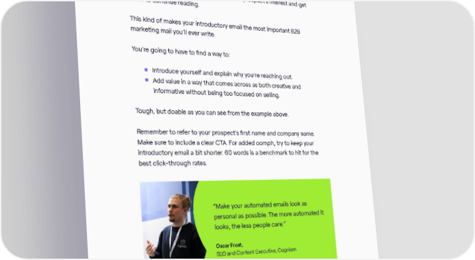 When you’re connecting with a customer for the first time, you’ve only got one shot to make an impression. Two sentences are all it takes to pique your prospect’s interest and get them to continue reading. This kind of makes your introductory email the most important B2B marketing mail you’ll ever write. You’re going to have to find a way to: Introduce yourself and explain why you’re reaching out. Add value in a way that comes across as both creative and informative without being too focused on selling. Tough, but doable as you can see from the example above. Remember to refer to your prospect’s first name and company name. Make sure to include a clear CTA. For added oomph, try to keep your introductory email a bit shorter. 60 words is a benchmark to hit for the best click-through rates. “Make your automated emails look as personal as possible. The more automated it looks, the less people care.” Oscar Frost, SEO and Content Executive, Cognism The ANYTHING BUT BASIC guide to email marketing / 19