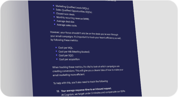 1 - Top-level metrics Lasering in on the following revenue focused metrics will help you win at email marketing: Marketing Qualified Leads (MQLs). Sales Qualified Opportunities (SQOs). Closed-won deals. Monthly recurring revenue (MRR). Average deal size. Average sales cycle. However, your focus shouldn’t only be on the deals you’ve won through your email campaigns. It’s important to track your team’s efficiency as well, by following these metrics: Cost per MQL. Cost per MB (Meeting Booked). Cost per SQO. Cost per acquisition. When tracking these metrics, it’s vital to look at which campaigns are creating conversions. This will give you a clearer idea of how to make your email marketing more efficient. To help with this, you’ll also need to track the following: 1.1. Your average response time to an inbound request. At Cognism, we target under 3 minutes and compensate our SDRs on this by tracking it daily. 1.2. The percentage of inbound requests that have an outcome. We try to target 70%. It’s one thing to action an inbound straight away, but you also want to motivate your SDRs to be persistent and track down outcomes consistently. The AThe ANYTNYTHING BUT BHING BUT BAASIC gSIC guide tuide to emo email mail markarkeetingting / / 3737