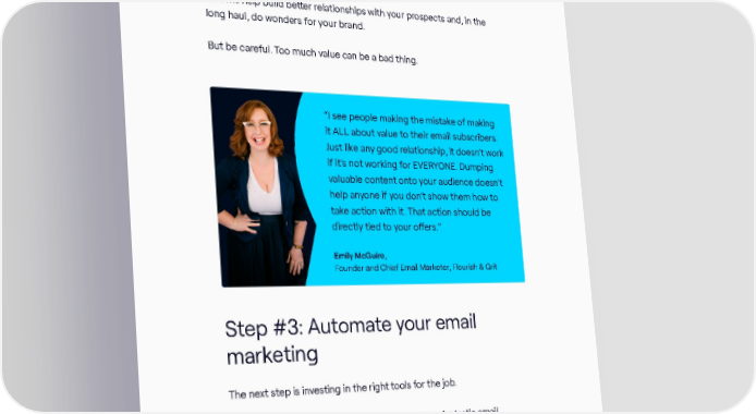Offer them an ungated piece of content, a link to a blog you think they’d enjoy, coupons, invites to free courses and webinars, access to gated content or a free trial of your product. This will help build better relationships with your prospects and, in the long haul, do wonders for your brand. But be careful. Too much value can be a bad thing. “I see people making the mistake of making it ALL about value to their email subscribers. Just like any good relationship, it doesn’t work if it’s not working for EVERYONE. Dumping valuable content onto your audience doesn’t help anyone if you don’t show them how to take action with it. That action should be directly tied to your offers.” Emily McGuire, Founder and Chief Email Marketer, Flourish & Grit Step #3: Automate your email marketing The next step is investing in the right tools for the job. This means taking advantage of one of the many fantastic email marketing tools available today. Not only can they help streamline your workflow, but they give you the ability to automate a large part of the email marketing process – freeing up time for you to focus on other areas of your business. The ANYTHING BUT BASIC guide to email marketing / 8