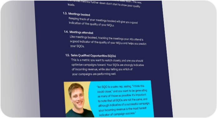 1.2. Marketing Qualified Leads (MQLs) These are the B2B leads that fit within your ICP and can be worked into your pipeline. It’s always a good idea to qualify your leads before handing them over to your outbound sales team. This way, the funnel metrics further down don’t start to show poor quality leads. 1.3. Meetings booked Keeping track of your meetings booked will give you a good indication of the quality of your MQLs. 1.4. Meetings attended Like meetings booked, tracking the meetings your AEs attend is a good indicator of the quality of your MQLs and helps you predict your SQOs. 1.5. Sales Qualified Opportunities (SQOs) This is a metric you want to watch closely, and one you should optimise campaigns toward. Your SQOs are strongly indicative of incoming revenue, while also telling you which of your campaigns are performing well. “An SQO is a sales rep, saying, “I think this could close,” and you want to be generating as many of those as possible. It’s important to note that all SQOs are not the same, and although indicative of a successful campaign, your incoming revenue is the most honest indicator of campaign success.” Liam Bartholomew, Global Head of Demand Generation, Cognism After these six, you’ll find that there are a number of vanity metrics you can track too. The AThe ANYTNYTHING BUT BHING BUT BAASIC gSIC guide tuide to emo email mail markarkeetingting / / 3939