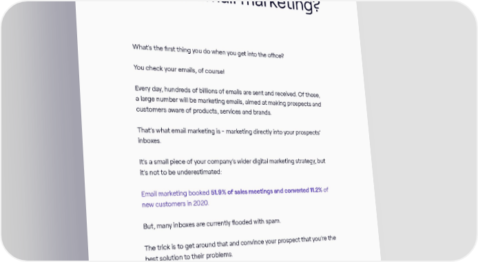 Introduction: What is email marketing? What’s the first thing you do when you get into the office? You check your emails, of course! Every day, hundreds of billions of emails are sent and received. Of those, a large number will be marketing emails, aimed at making prospects and customers aware of products, services and brands. That’s what email marketing is - marketing directly into your prospects’ inboxes. It’s a small piece of your company’s wider digital marketing strategy, but it’s not to be underestimated: Email marketing booked 51.9% of sales meetings and converted 11.2% of new customers in 2020. But, many inboxes are currently flooded with spam. The trick is to get around that and convince your prospect that you’re the best solution to their problems. You need to think smart. And, this guide is going to help you do just that! The ANYTHING BUT BASIC guide to email marketing / 4