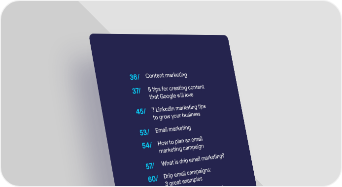 36/ Content marketing 37/ 5 tips for creating content that Google will love 45/ 7 LinkedIn marketing tips to grow your business 53/ Email marketing 54/ How to plan an email marketing campaign 57/ What is drip email marketing? 60/ Drip email campaigns: 3 great examples 66/ What is lead nurturing and how can you do it? 72/ Lead nurturing tips 77/ 8 ways to improve email deliverability 83/ Conclusion