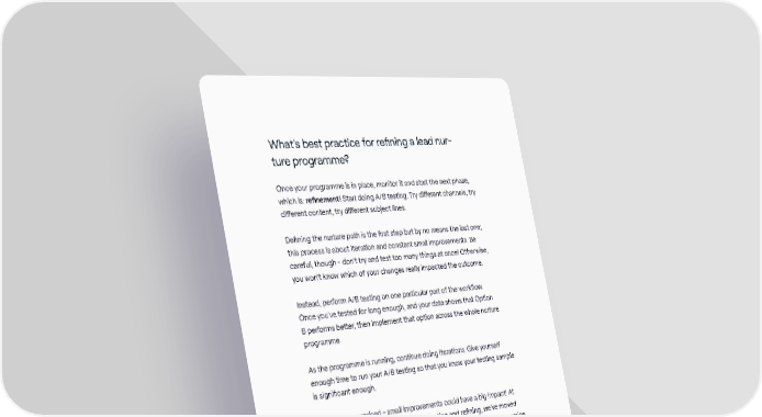 What’s best practice for refining a lead nur- ture programme? Once your programme is in place, monitor it and start the next phase, which is: refinement! Start doing A/B testing. Try different channels, try different content, try different subject lines. Defining the nurture path is the first step but by no means the last one; this process is about iteration and constant small improvements. Be careful, though - don’t try and test too many things at once! Otherwise, you won’t know which of your changes really impacted the outcome. Instead, perform A/B testing on one particular part of the workflow. Once you’ve tested for long enough, and your data shows that Option B performs better, then implement that option across the whole nurture programme. As the programme is running, continue doing iterations. Give yourself enough time to run your A/B testing so that you know your testing sample is significant enough. You may be surprised - small improvements could have a big impact! At Workbooks.com, due to rigorous A/B testing and refining, we’ve moved from a lead to pipeline conversion of less than 10% to a current conversion at 25%, which is a substantial shift in performance. Bonus tip You’ll find similar practical advice for improving business performance over on the Workbooks blog. It’s recommended reading for growth- focused marketers! The Inbound Marketing Playbook / 71