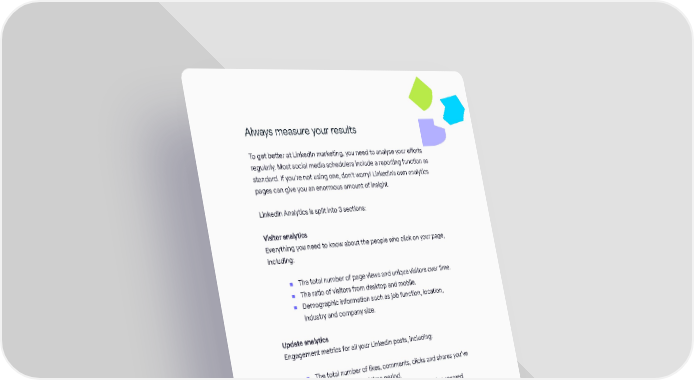Always measure your results To get better at LinkedIn marketing, you need to analyse your efforts regularly. Most social media schedulers include a reporting function as standard. If you’re not using one, don’t worry! LinkedIn’s own analytics pages can give you an enormous amount of insight. LinkedIn Analytics is split into 3 sections: Visitor analytics Everything you need to know about the people who click on your page, including: • The total number of page views and unique visitors over time. • The ratio of visitors from desktop and mobile. • Demographic information such as job function, location, industry and company size. Update analytics Engagement metrics for all your LinkedIn posts, including: • The total number of likes, comments, clicks and shares you’ve had over a specified time period. • The ratio of engagement between organic and sponsored content (if you’re running any LinkedIn ads). • Real-time data on a post-by-post basis, including impressions, views, clicks and LinkedIn’s own aggregated engagement rate. Follower analytics All the information you need on your audience, including: • The total number of followers you’ve got and how many new followers you gained in the last 30 days. • Demographic data on all of your followers, showing you where they live and work. • A competitor tracker, comparing your followers and updates to those of other similar companies. The Inbound Marketing Playbook / 51