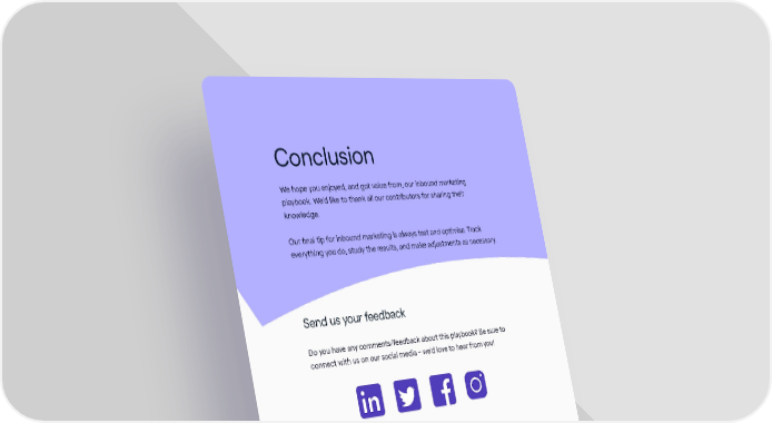 Conclusion We hope you enjoyed, and got value from, our inbound marketing playbook. We’d like to thank all our contributors for sharing their knowledge. Our final tip for inbound marketing is always test and optimise. Track everything you do, study the results, and make adjustments as necessary. Send us your feedback Do you have any comments/feedback about this playbook? Be sure to connect with us on our social media - we’d love to hear from you! Contact Cognism today Cognism can help you solve a variety of marketing challenges. Our accurate, compliant and intelligent B2B data can be used to: • Identify new audiences. • Run data-driven campaigns. • Boost email deliverability. • Increase audience match rates. The Inbound Marketing Playbook / 83