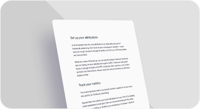 Set up your attributions A lot of people miss this, but attribution is an absolutely key part of Facebook advertising. Don’t look at your campaigns in isolation - make sure you’ve got access to Google Analytics and that your UTM parameters are incorporated. When you have all this set up, you can see the impact that your Facebook ads are having on your website and organic traffic. There are many great tools on Google Analytics that PPC marketers often overlook, such as first and last click interactions. Always study the data and make your decisions based on that. Track your metrics The most important metric you should monitor is spend! It can run away very quickly on Facebook advertising. Beyond that, the metrics you track will depend on your KPIs. If increasing brand awareness is your goal, then you should be looking at the clicks your ads are getting, or whether you are seeing an increase in direct or brand traffic. What I like to do is have metrics in place for each stage of the funnel. So, at the top of the funnel, I’ll track impressions to clicks. At mid-funnel, I’ll track the click to lead rate. Finally, at the bottom of the funnel, I’ll look at the lead to sale rate. How often should you track your metrics? Daily, is my answer! Check them every day. See what’s converting and what isn’t. Daily metric tracking means that you can make quick adjustments to your Facebook ads and, hopefully, improve their performance! The Inbound Marketing Playbook / 34