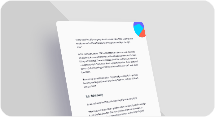 “Every email in a drip campaign should provide value. Make sure that your emails are useful. Show that you have thought leadership in the right area.” In this campaign, James’ CTA (call to action) is a demo request. The leads will still be able to view the content without booking a demo, but it’s there if they’re interested. The demo request should be positioned as free value - an opportunity to learn more about a potential solution. If your leads feel as though they’re being pushed into a demo which they don’t want, you’ll lose them. If you set up an ‘additional value’ drip campaign successfully - you’ll be booking meetings with leads who already trust you, and your SDRs will love you for it! Key takeaway James had some final thoughts regarding drip email campaigns: “Making sure that you have a good structure for your drip email campaign is only the first step. Use data from previous drip email campaigns to refine future campaigns, review the sequences as they’re running and nurture them.” “One of the many great things about drip email campaigns is that you have the ability to change them in an instant. If something isn’t working, change it! If something is working well, use it as inspiration for your other campaigns.” “Like many areas of marketing, the value lies in your ability to improve over time.” The Inbound Marketing Playbook / 65