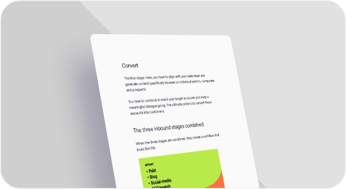 Convert The final stage. Here, you have to align with your sales team and generate content specifically focused on individual sectors, companies and prospects. You have to use tools to reach your target accounts and keep a meaningful dialogue going. The ultimate prize is to convert those accounts into customers. The three inbound stages combined When the three stages are combined, they create a workflow that looks like this: The Inbound Marketing Playbook / 4