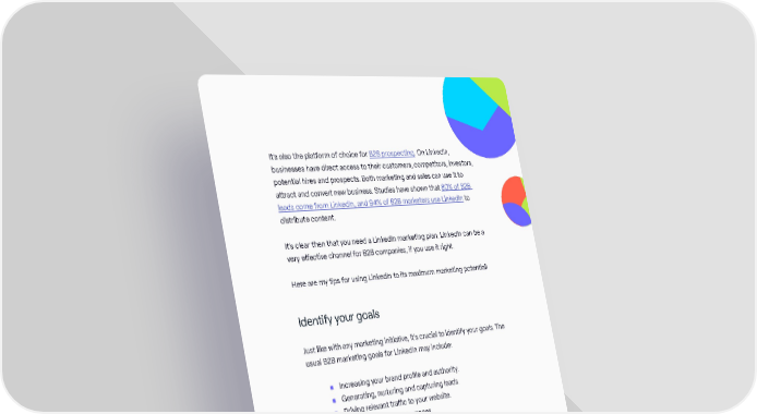 It’s also the platform of choice for B2B prospecting. On LinkedIn, businesses have direct access to their customers, competitors, investors, potential hires and prospects. Both marketing and sales can use it to attract and convert new business. Studies have shown that 80% of B2B leads come from LinkedIn, and 94% of B2B marketers use LinkedIn to distribute content. It’s clear then that you need a LinkedIn marketing plan. LinkedIn can be a very effective channel for B2B companies, if you use it right. Here are my tips for using LinkedIn to its maximum marketing potential! Identify your goals Just like with any marketing initiative, it’s crucial to identify your goals. The usual B2B marketing goals for LinkedIn may include: • Increasing your brand profile and authority. • Generating, nurturing and capturing leads. • Driving relevant traffic to your website. • Promoting event appearances. Once you know what your goals are, it’s easier to formulate a marketing plan that works. Complete your company profile On LinkedIn, your company profile will always be the heart and soul of your online brand. As people search for your business online and get to know more about your products and services, it’s imperative to have a rock-solid profile. The Inbound Marketing Playbook / 46