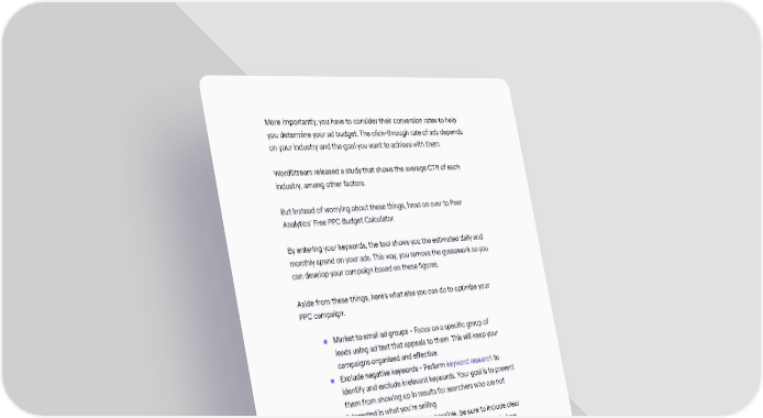 More importantly, you have to consider their conversion rates to help you determine your ad budget. The click-through rate of ads depends on your industry and the goal you want to achieve with them. WordStream released a study that shows the average CTR of each industry, among other factors. But instead of worrying about these things, head on over to Peer Analytics’ Free PPC Budget Calculator. By entering your keywords, the tool shows you the estimated daily and monthly spend on your ads. This way, you remove the guesswork so you can develop your campaign based on these figures. Aside from these things, here’s what else you can do to optimise your PPC campaign: • Market to small ad groups - Focus on a specific group of leads using ad text that appeals to them. This will keep your campaigns organised and effective. • Exclude negative keywords - Perform keyword research to identify and exclude irrelevant keywords. Your goal is to prevent them from showing up in results for searchers who are not interested in what you’re selling. • Use compelling CTAs - When possible, be sure to include clear and concise calls to action to drive visitors to a desired place. Last but not least, you’ll want to monitor and iterate (potentially) all aspects of your new PPC campaign/s. Make adjustments routinely. Create negative keyword lists if your keyword targeting isn’t specific enough. Run A/B tests on ad copy to drive greater click-through rates. Adjust your bid strategy or actual bids in order to lower CPC’s and improve your ROI. The sky is the limit. But don’t just set up a campaign and let it run itself. PPC campaigns require maintenance and ongoing optimisations. So no excuses! The Inbound Marketing Playbook / 14