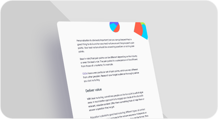 Personalisation is obviously important, but you can go beyond that. A good thing to do is anchor your lead nurture around the prospect’s pain points. Your lead nurture should be answering questions or solving pain points. Bear in mind that pain points can be different depending on the industry or even the lead’s role. The pain points for a salesperson will be different from those of a marketer, for example. CEOs have a very particular set of pain points, which are very different from other people’s. Research your target audience thoroughly before you start nurturing. Deliver value With lead nurturing, sometimes people can be too quick to sell straight away. A much better approach is to engage your leads at the start with relevant, valuable content. Offer them something that will help them or answer a question they’ve got. Education is pivotal to good lead nurturing. Different types of content work better at certain junctures in the nurture sequence. It depends on what your goal is. If you want to progress leads through the funnel, then case studies can be very effective. Anticipate behaviours So much of lead nurturing is about predicting how people are going to behave. Which actions are people going to take? A good lead nurture sequence should have branches for people to go down - but there must always be a ‘golden path’ that you want your leads to follow. Every branch must guide them back to that path. Don’t be afraid of giving your leads options. You can learn a great deal from the options that people choose. Then, you can use those insights to optimise your sequence. The Inbound Marketing Playbook / 73