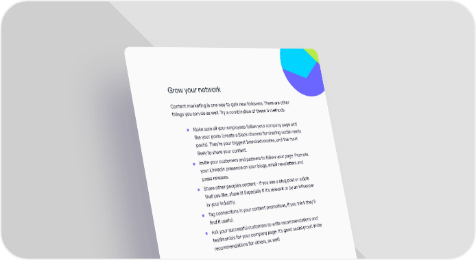 Grow your network Content marketing is one way to gain new followers. There are other things you can do as well. Try a combination of these 5 methods: • Make sure all your employees follow your company page and like your posts (create a Slack channel for sharing social media posts). They’re your biggest brand advocates, and the most likely to share your content. • Invite your customers and partners to follow your page. Promote your LinkedIn presence on your blogs, email newsletters and press releases. • Share other people’s content - if you see a blog post or article that you like, share it! Especially if it’s relevant or by an influencer in your industry. • Tag connections in your content promotions, if you think they’ll find it useful. • Ask your successful customers to write recommendations and testimonials for your company page. It’s good social proof. Write recommendations for others, as well! Don’t be afraid to experiment When you’ve mastered the basics of LinkedIn marketing, it’s time to diversify. Experiment with posting at different times of the day or week. If you find that a particular type of post gets more engagement than others - do more of it! Again, look at your competitor’s pages. How effectively are they using LinkedIn? Is there anything they’re doing that you do? Or conversely, is there anything they’re not doing that you can do? Seek out the gaps that exist in your sector and see if you can fill them. The Inbound Marketing Playbook / 50