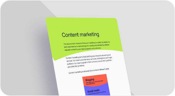 Content marketing The second main channel of inbound marketing is content marketing. It’s best described as a methodology for creating and distributing relevant, valuable content to your ideal prospects and customers. Content marketing isn’t simply pitching your products and selling your services. You have to provide value, real value, and insight to your target audience. You have to speak to their concerns, answer their questions and solve their problems. Content marketing is delivered via a number of different media: The Inbound Marketing Playbook / 36